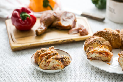 Koostisosad: nisujahu, muna, suitsukana 20 % (Broileriliha 89%, vesi, broilerinahk, riisitärklis, sool, lihavalk, happesuse regulaatorid: E262, E451; stabilisaatorid: E415, E452; suhkur, säilitusaine E250), piim, või, konservananass , paprika, fitaki (pastöriseeritud piim sool, mikroobne laap, happesuse regulaator (E575)), salsakaste (Tomatipüree 35%, suhkur, piiritusäädikas, vesi, tomat 7,5% (tardaine: kaltsiumkloriid), paprika, sibul, jalapenotšilli 2,9%, tomatimahl 2,5%, modifitseeritud tärklis, jodeeritud sool, punapeedimahla kontsentraat, lõhna- ja maitseained, vürtsid, paksendaja (ksantaankummi), hape (sidrunhape). Võib sisaldada piima ja selleri jääke), suhkur, pärm, valged seesamiseemned, sool.